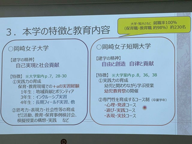 少子化で保育職が敬遠されがちな時代ですが、私たちは創設者の「自分の道は自分で開け」という思いを受け継ぎ、歩みを止めません。いよいよ来月からは「共学化」を果たし、名称も「岡崎大学」「岡崎短期大学」へと生まれ変わります。